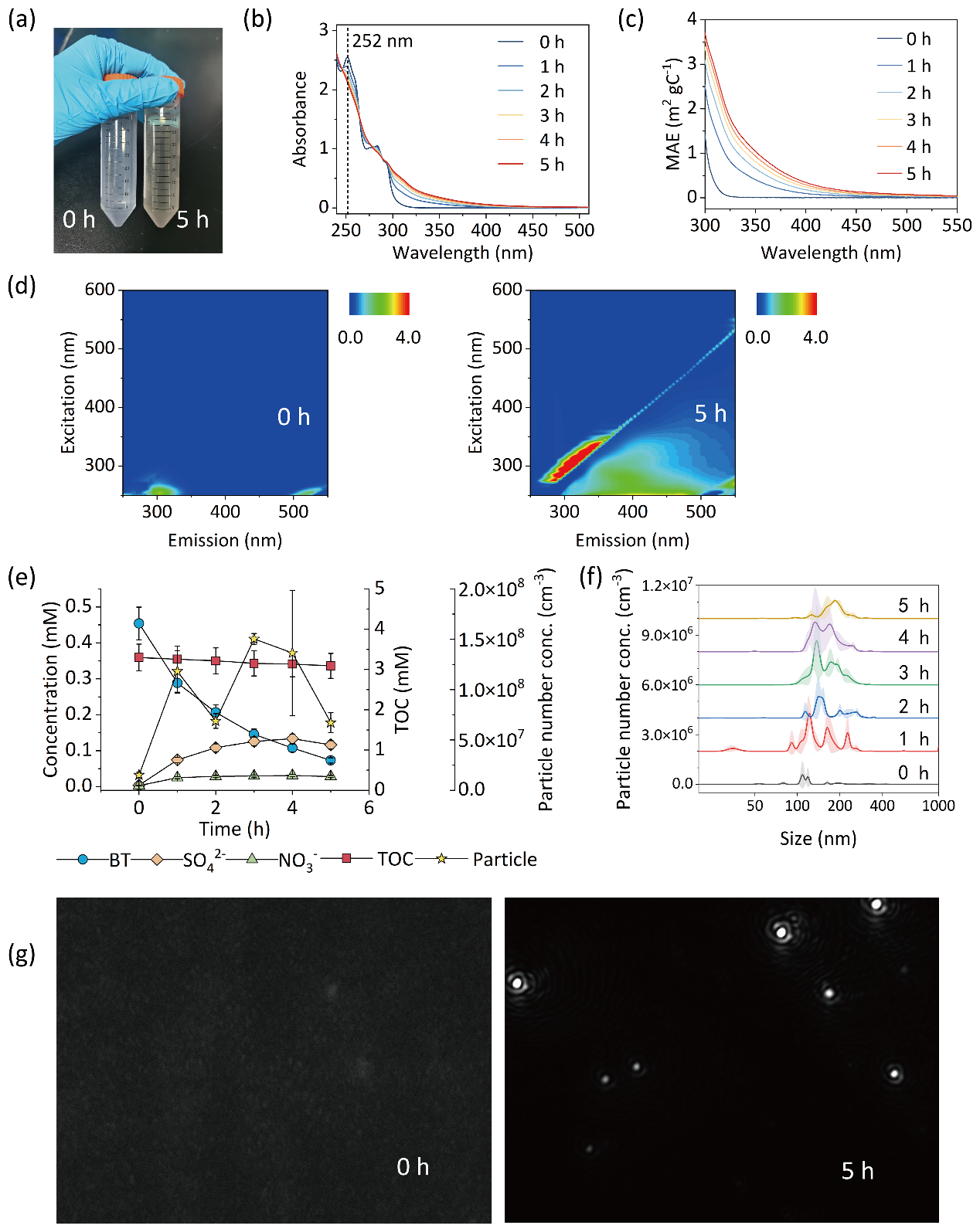 ▲ BTs在大气液相光氧化模拟中的光学特性变化、降解过程和纳米颗粒物生成