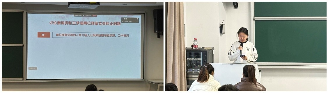 随后秦锦贤、王梦瑶两位预备党员的入党介绍人分别介绍了她们在培养考察期间的政治表现、学习态度和组织纪律性,一致认为他们思想上主动学习党的创新理论知识,工作中能够以党员标准要求自身,乐于为同学服务,入党动机端正,均同意推荐这两名预备党员按期转正。