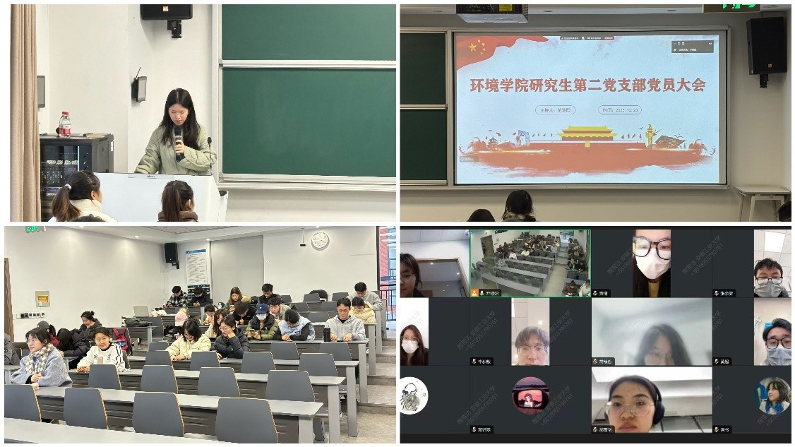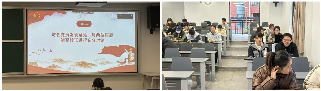 2025年12月23日,环境学院研究生第二党支部在杭高院云艺园区13号楼110教室召开党员大会,讨论秦锦贤、王梦瑶两名预备党员转正问题。会议由支部书记范慧阳同志主持,本次会议应到党员52名,实到党员46名,实到会有表决权的党员人数超过应到会有表决权党员人数的半数,大会有效。