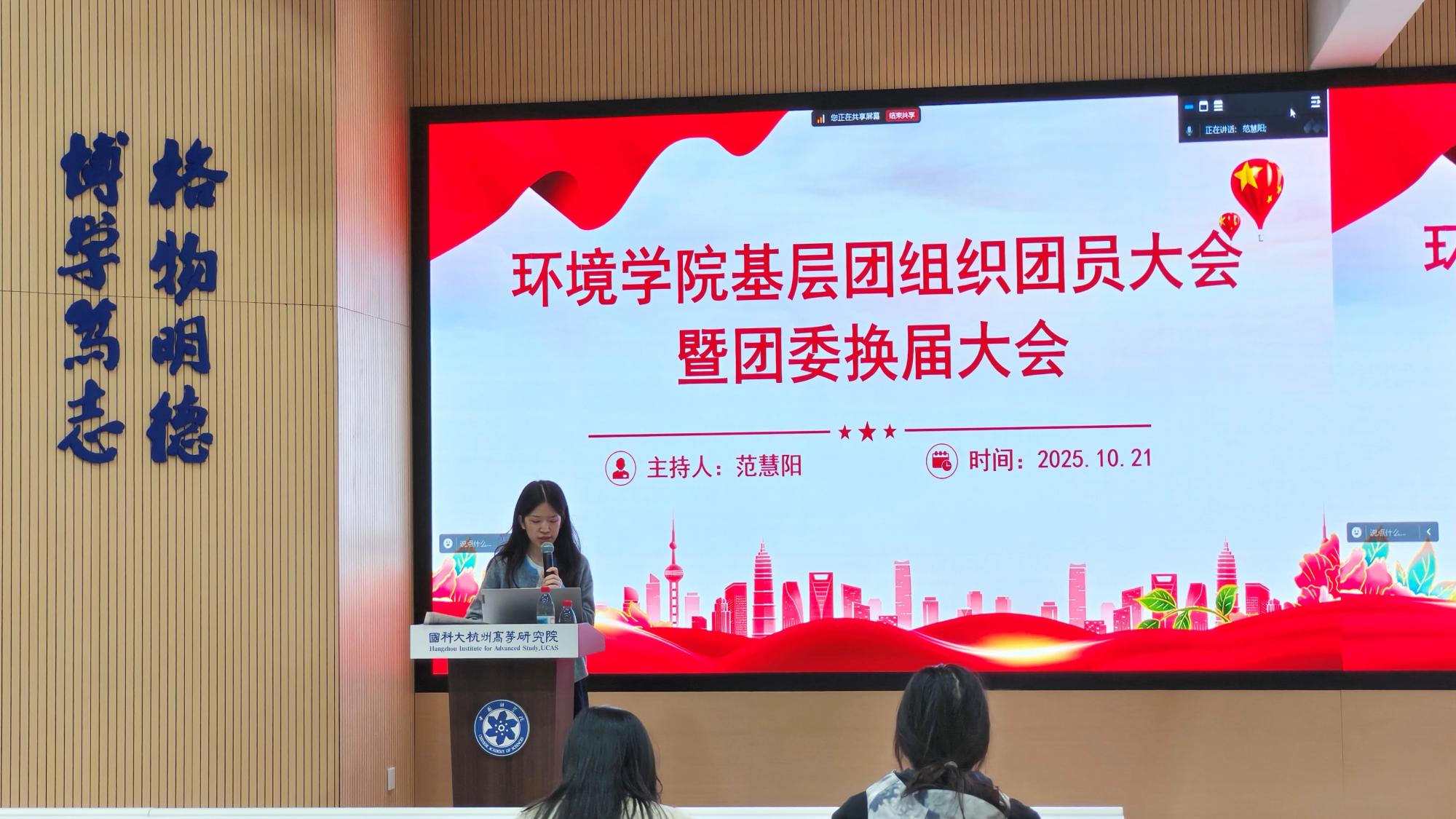 为加强国科大杭州高等研究院环境学院基层团组织建设,提升共青团干部的工作水平,深入贯彻落实习近平总书记关于青年工作的重要思想,根据《中国共产主义青年团章程》《中国共产主义青年团基层组织选举工作条例》等文件规定,结合我院团委实际和发展需要,2025年10月21日下午,环境学院基层团组织团员大会暨团委换届大会在谷源院区4号楼报告厅顺利召开。