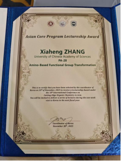 近日,国科大杭州高等研究院化学与材料科学学院张夏衡研究员荣获2025年度“Asian Core Program Lectureship Award”国际学术奖,以表彰其在有机合成化学领域持续作出的杰出贡献。在海南三亚崖州湾召开的第十八届亚洲尖端有机化学前沿国际研讨会(18th International Conference on Cutting-Edge Organic Chemistry in Asia)上,张夏衡研究员以“Amino-Based Functional Group Transformation”为主题进行学术交流,分享了其研究团队在该前沿领域的最新突破,获与会专家学者广泛关注与认可,并荣获“Asian Core Program Lectureship Award”(亚洲核心计划报告奖)。获奖者将受邀于下一年赴相应国家与地区进行为期一周的访问,并在此期间发表系列学术演讲。