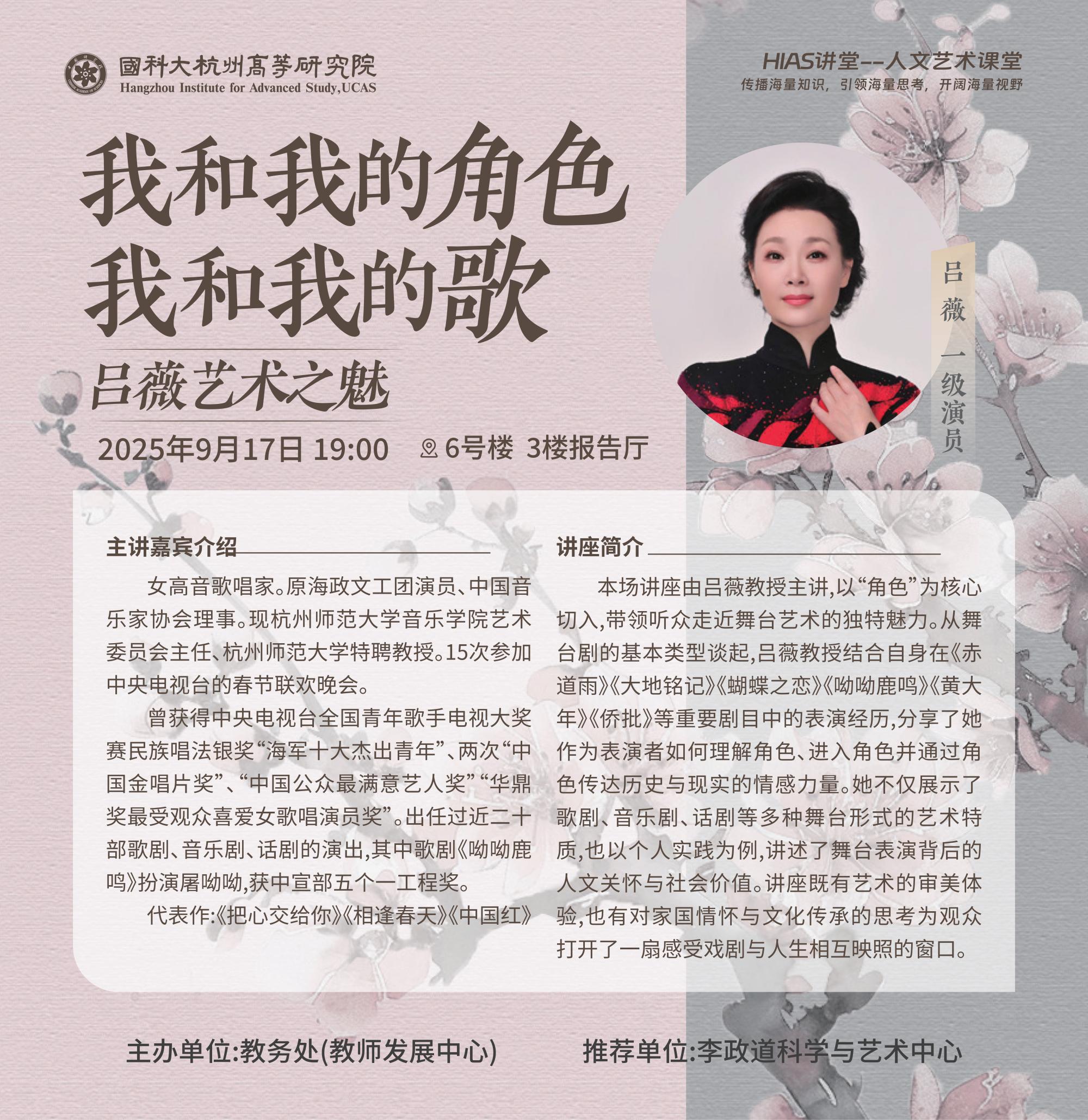 本场讲座由吕薇教授主讲,以“角色”为核心切入,带领听众走近舞台艺术的独特魅力。从舞台剧的基本类型谈起,吕薇教授结合自身在《赤道雨》《大地铭记》《蝴蝶之恋》《呦呦鹿鸣》《黄大年》《侨批》等重要剧目中的表演经历,分享了她作为表演者如何理解角色、进入角色并通过角色传达历史与现实的情感力量。她不仅展示了歌剧、音乐剧、话剧等多种舞台形式的艺术特质,也以个人实践为例,讲述了舞台表演背后的人文关怀与社会价值。讲座既有艺术的审美体验,也有对家国情怀与文化传承的思考,为观众打开了一扇感受戏剧与人生相互映照的窗口。