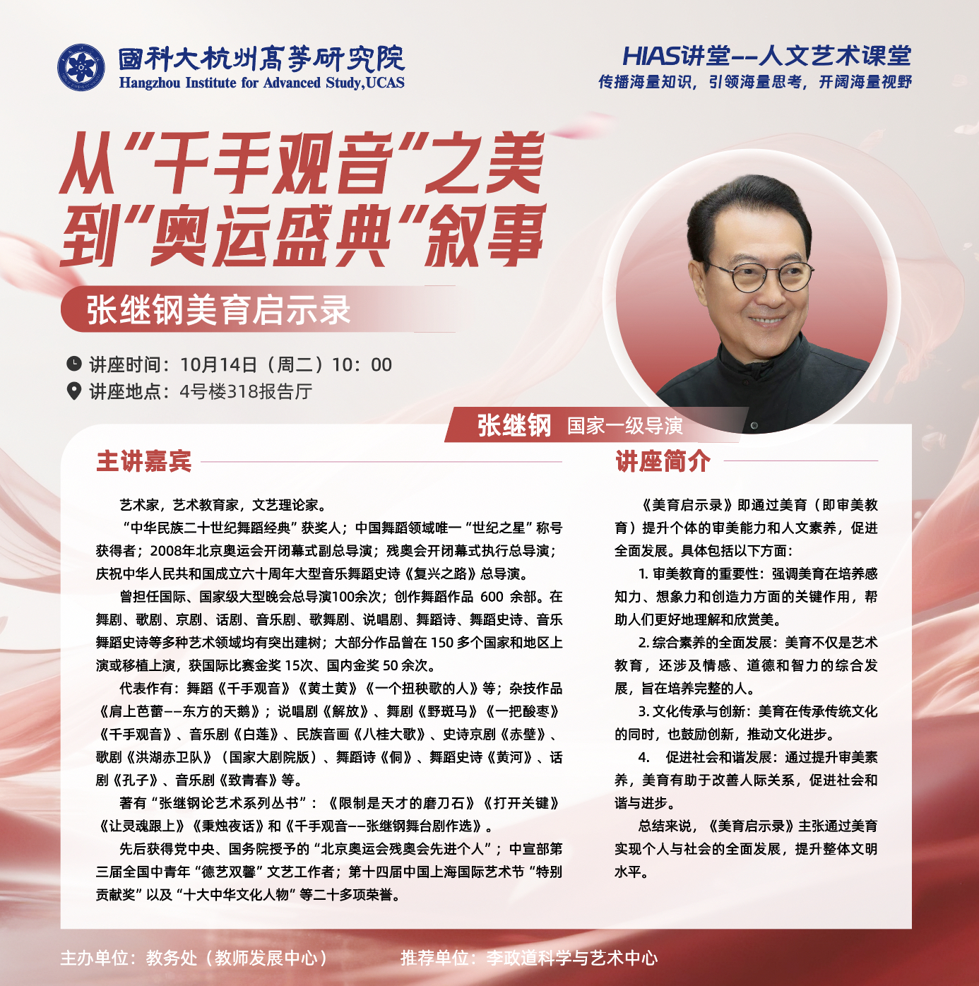 当前位置: 网站首页 > 教育教学 > HIAS讲堂 > 正文 从“千手观音”之美到“奥运盛典”叙事——张继钢美育启示录 浏览量:时间:2025-10-11 讲座时间:10月14日(周二) 10:00-12:00 讲座地点:4号楼多功能报告厅(318) 主讲嘉宾: 张继钢,艺术家,艺术教育家,文艺理论家。“中华民族二十世纪舞蹈经典”获奖人;中国舞蹈领域唯一“世纪之星”称号获得者;2008年北京奥运会开闭幕式副总导演;残奥会开闭幕式执行总导演;庆祝中华人民共和国成立六十周年大型音乐舞蹈史诗《复兴之路》总导演。 讲座简介: 《美育启示录》即通过美育(即审美教育)提升个体的审美能力和人文素养,促进全面发展。