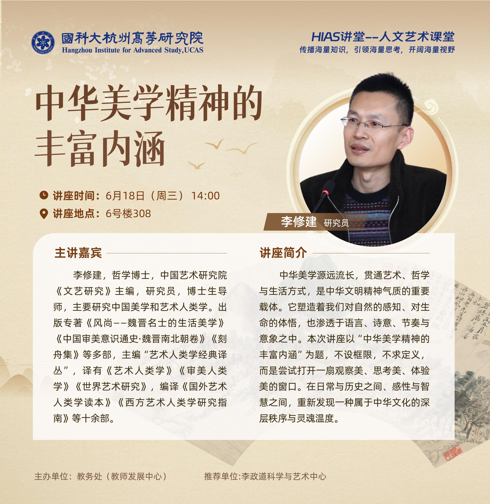 中华美学源远流长,贯通艺术、哲学与生活方式,是中华文明精神气质的重要载体。它塑造着我们对自然的感知、对生命的体悟,也渗透于语言、诗意、节奏与意象之中。本次讲座以“中华美学精神的丰富内涵”为题,不设框限,不求定义,而是尝试打开一扇观察美、思考美、体验美的窗口。在日常与历史之间、感性与智慧之间,重新发现一种属于中华文化的深层秩序与灵魂温度。