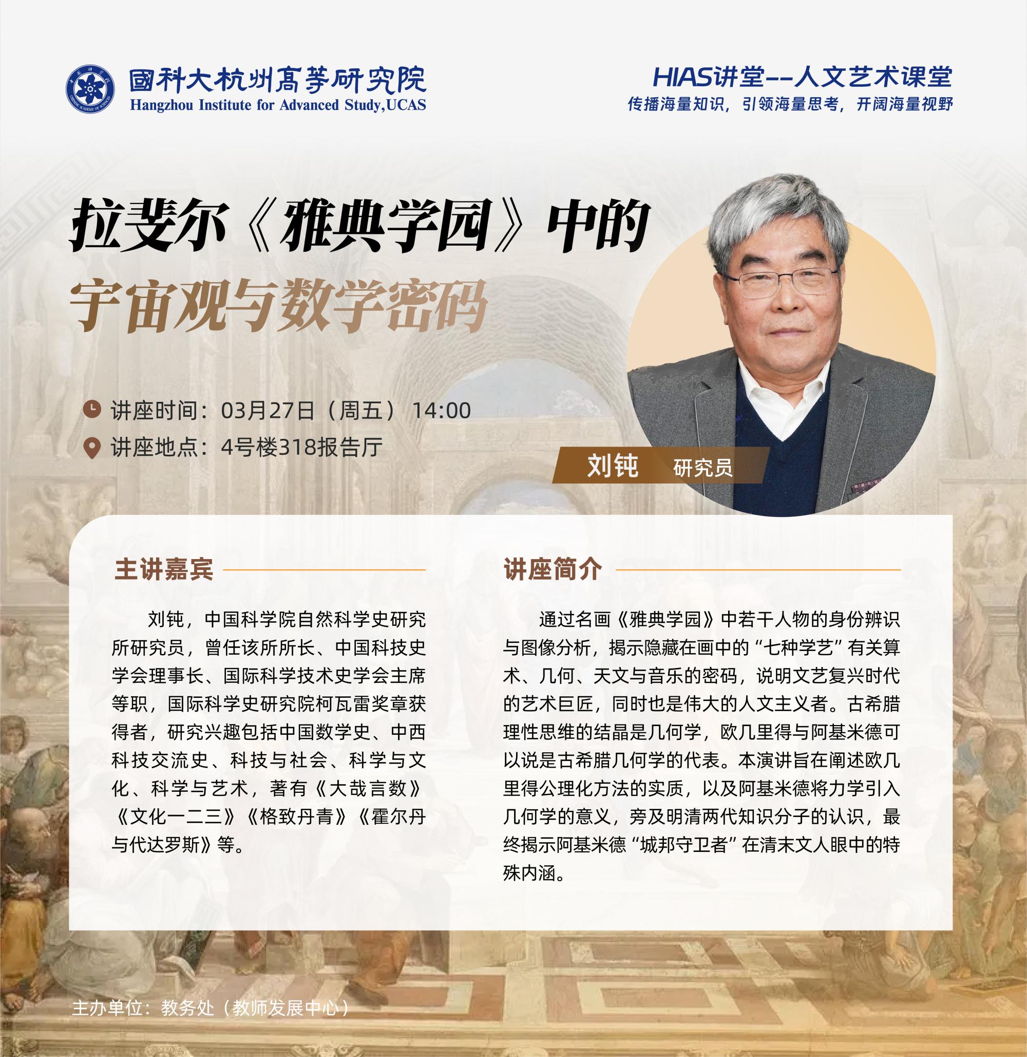 通过名画《雅典学园》中若干人物的身份辨识与图像分析,揭示隐藏在画中的“七种学艺”有关算术、几何、天文与音乐的密码,说明文艺复兴时代的艺术巨匠,同时也是伟大的人文主义者。古希腊理性思维的结晶是几何学,欧几里得与阿基米德可以说是古希腊几何学的代表。本演讲旨在阐述欧几里得公理化方法的实质,以及阿基米德将力学引入几何学的意义,旁及明清两代知识分子的认识,最终揭示阿基米德“城邦守卫者”在清末文人眼中的特殊内涵。