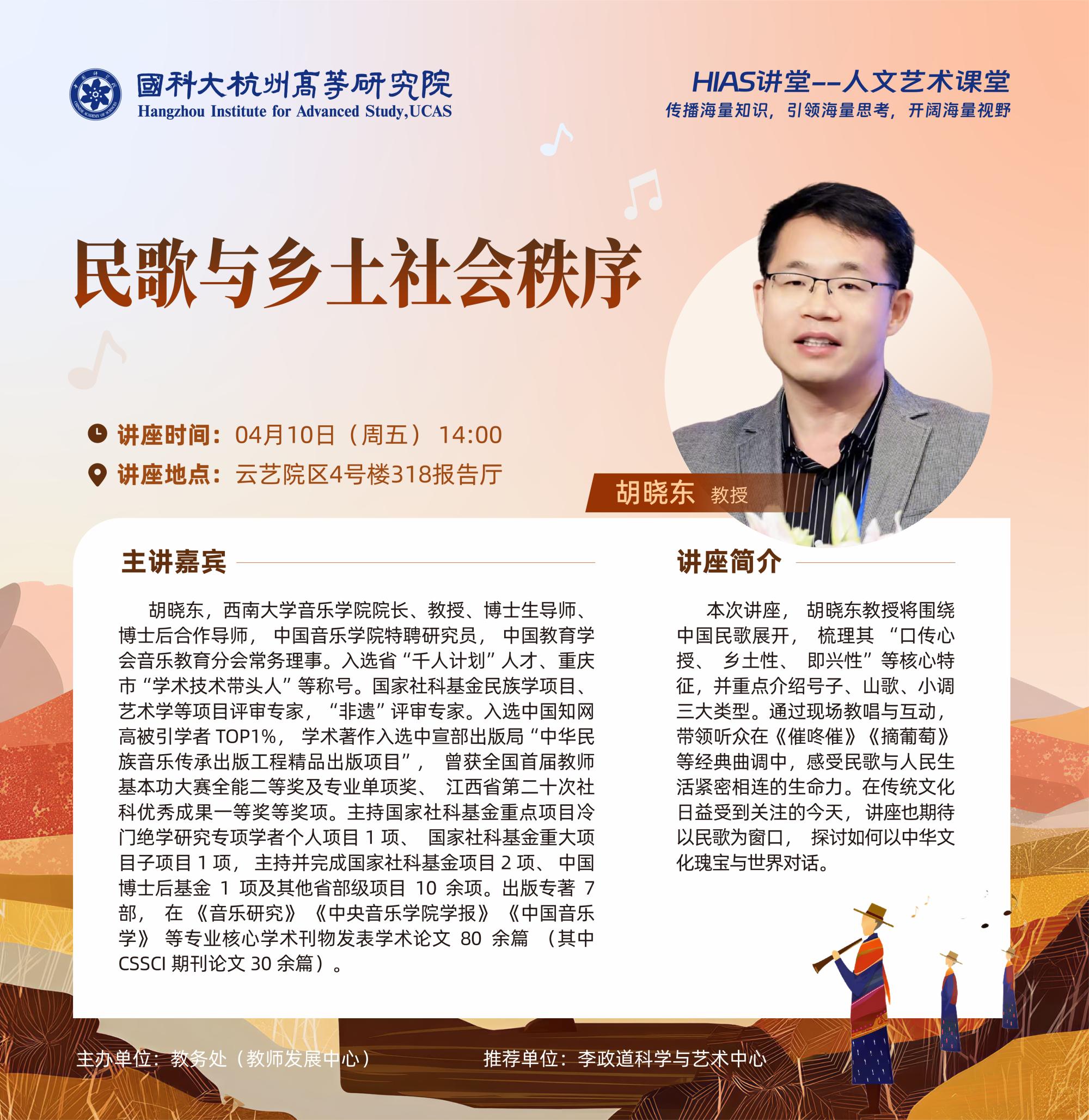 本次讲座,胡晓东教授将围绕中国民歌展开,梳理其“口传心授、乡土性、即兴性”等核心特征,并重点介绍号子、山歌、小调三大类型。通过现场教唱与互动,带领听众在《催咚催》《摘葡萄》等经典曲调中,感受民歌与人民生活紧密相连的生命力。在传统文化日益受到关注的今天,讲座也期待以民歌为窗口,探讨如何以中华文化瑰宝与世界对话。