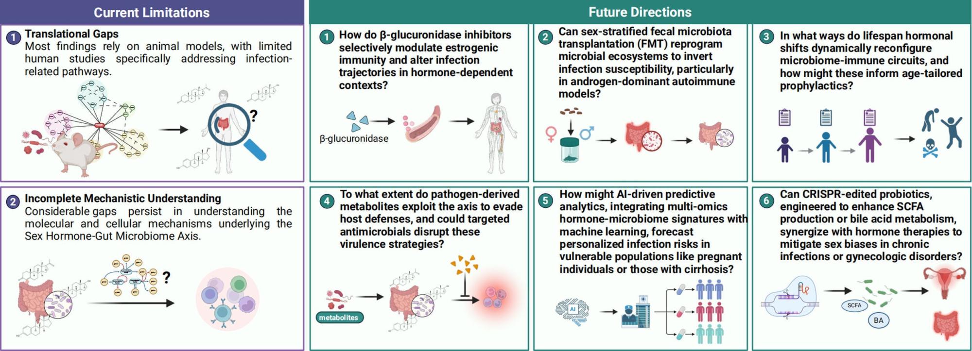 该综述依托课题组近期发表于 Nature Medicine 的沙门菌感染研究成果(doi: 10.1038/s41591-025-03644-4),整合了流行病学证据、动物模型机制研究及早期临床观察,指出现阶段人类研究和分子机制层面仍存在显著知识缺口,并提出未来研究应结合 AI、CRISPR 微生物组编辑以及性别特异 FMT 等研究方向,以推动感染性疾病和免疫性疾病的精准医学发展。