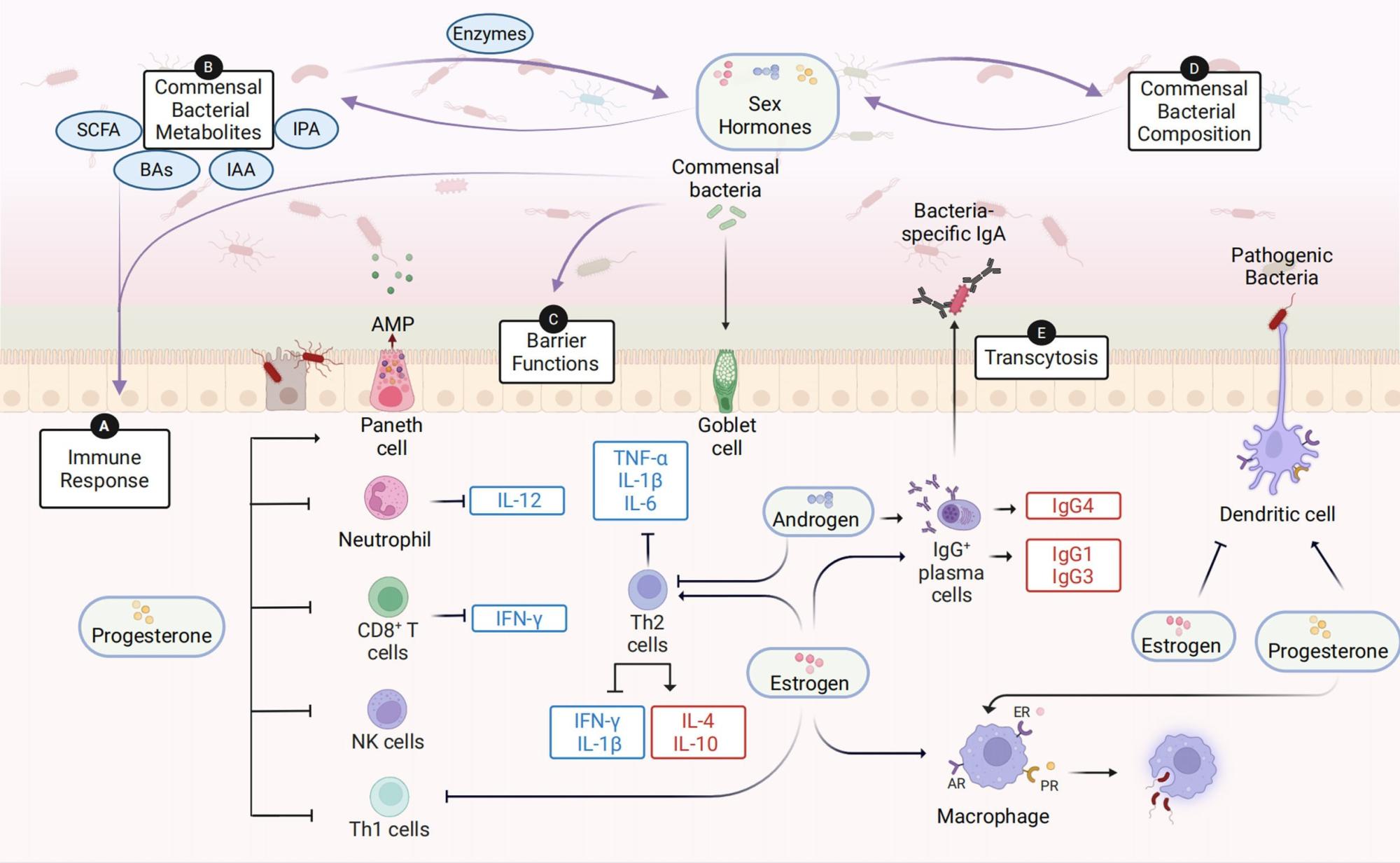 该综述重点讨论了性激素(如雌激素、孕激素)以及典型微生物代谢物(如短链脂肪酸、胆汁酸)如何通过调控关键通路,影响病原体毒力、宿主免疫状态和黏膜屏障稳态。