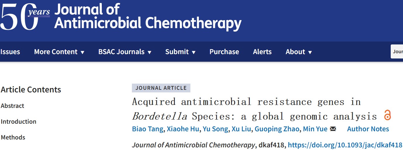 近日,国科大杭州高等研究院(以下简称杭高院)生命与健康科学学院(以下简称生命学院)乐敏/唐标团队在英国抗菌化疗学会国际权威期刊《Journal of Antimicrobial Chemotherapy》(药学top)在线发表了题为《Acquired antimicrobial resistance genes in Bordetella Species: a global genomic analysis》的研究论文。该研究首次系统描绘了非百日咳鲍特菌属中获得性抗生素耐药基因的全球分布与传播特征,并对其作为耐药基因潜在风险提出预警。