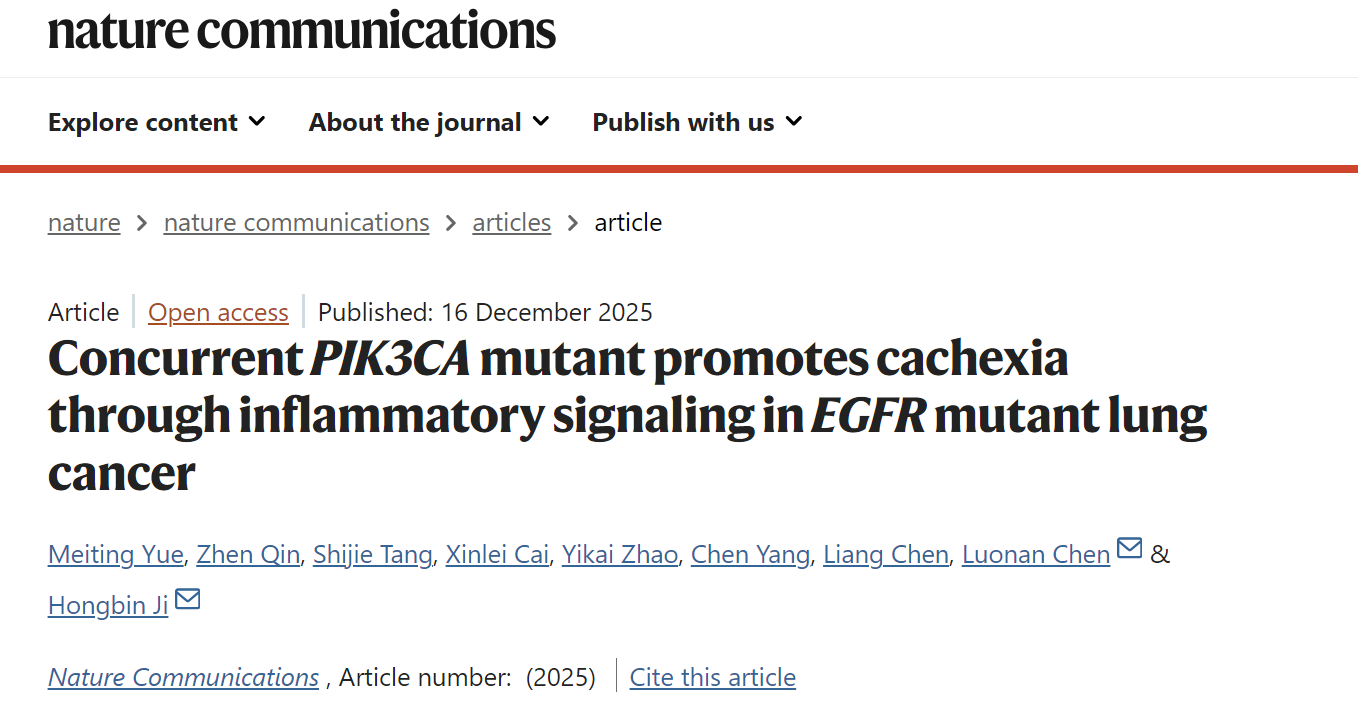 近日,国际学术期刊 Nature Communications 在线发表了国科大杭州高等研究院(以下简称杭高院)生命与健康科学学院/中国科学院分子细胞科学卓越创新中心季红斌研究组和陈洛南研究组合作的最新研究成果Concurrent PIK3CA mutant promotes cachexia through inflammatory signaling in EGFR mutant lung cancer。该研究系统揭示了 PIK3CA 突变在 EGFR 突变肺癌中的核心生物学功能并非肿瘤起始,而是通过激活炎症信号通路驱动恶病质进展,从而加速疾病恶化并影响患者生存结局,为 EGFR 突变肺癌的临床管理提供了新的机制解释与干预思路。