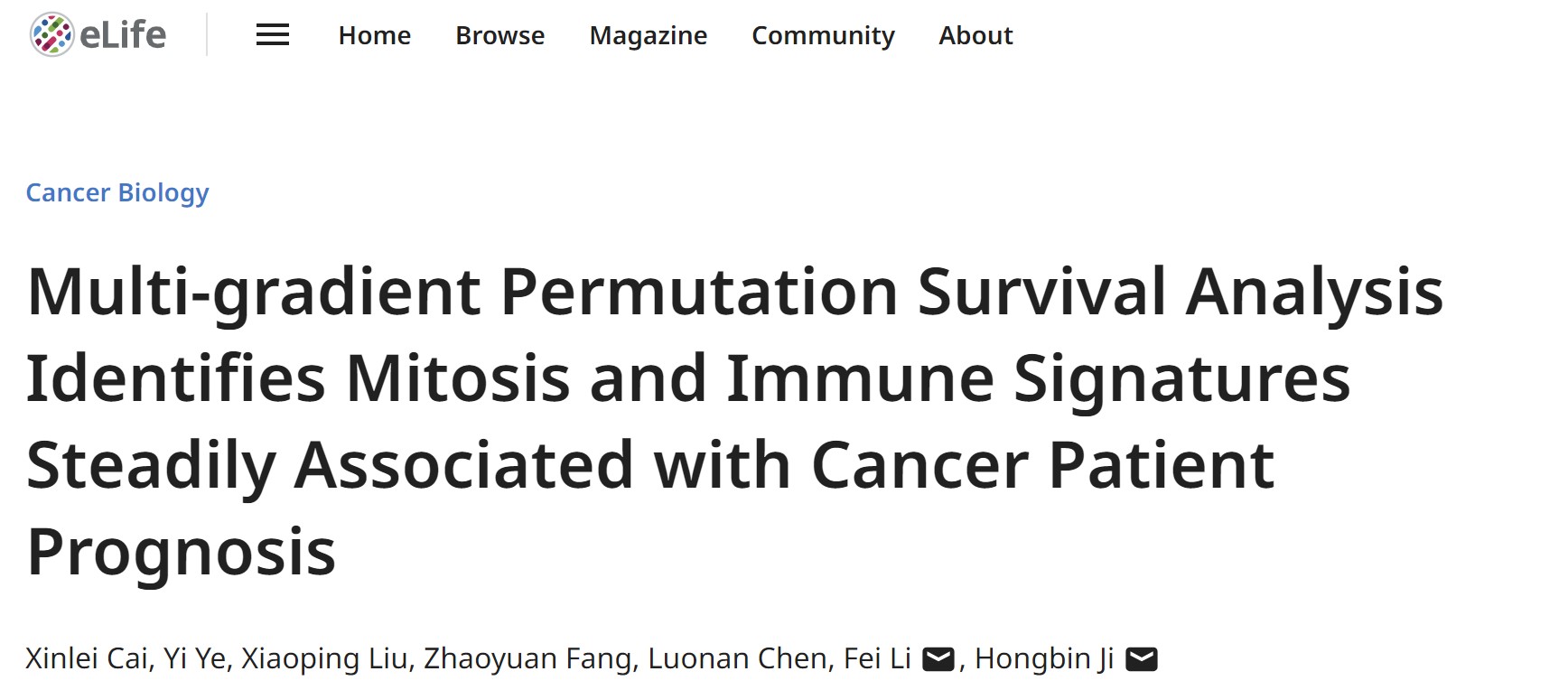 近日,国际学术期刊 eLife 在线发表了国科大杭州高等研究院(以下简称杭高院)生命与健康科学学院季红斌研究组的最新研究成果 Multi-gradient Permutation Survival Analysis Identifies Mitosis and Immune Signatures Steadily Associated with Cancer Patient Prognosis。该研究开发了名为 MEMORY 的新型生存分析算法,系统识别了泛癌种中与患者预后稳定相关的基因集(GEARs),并揭示了有丝分裂和免疫特征作为预后核心标志物的重要临床价值。