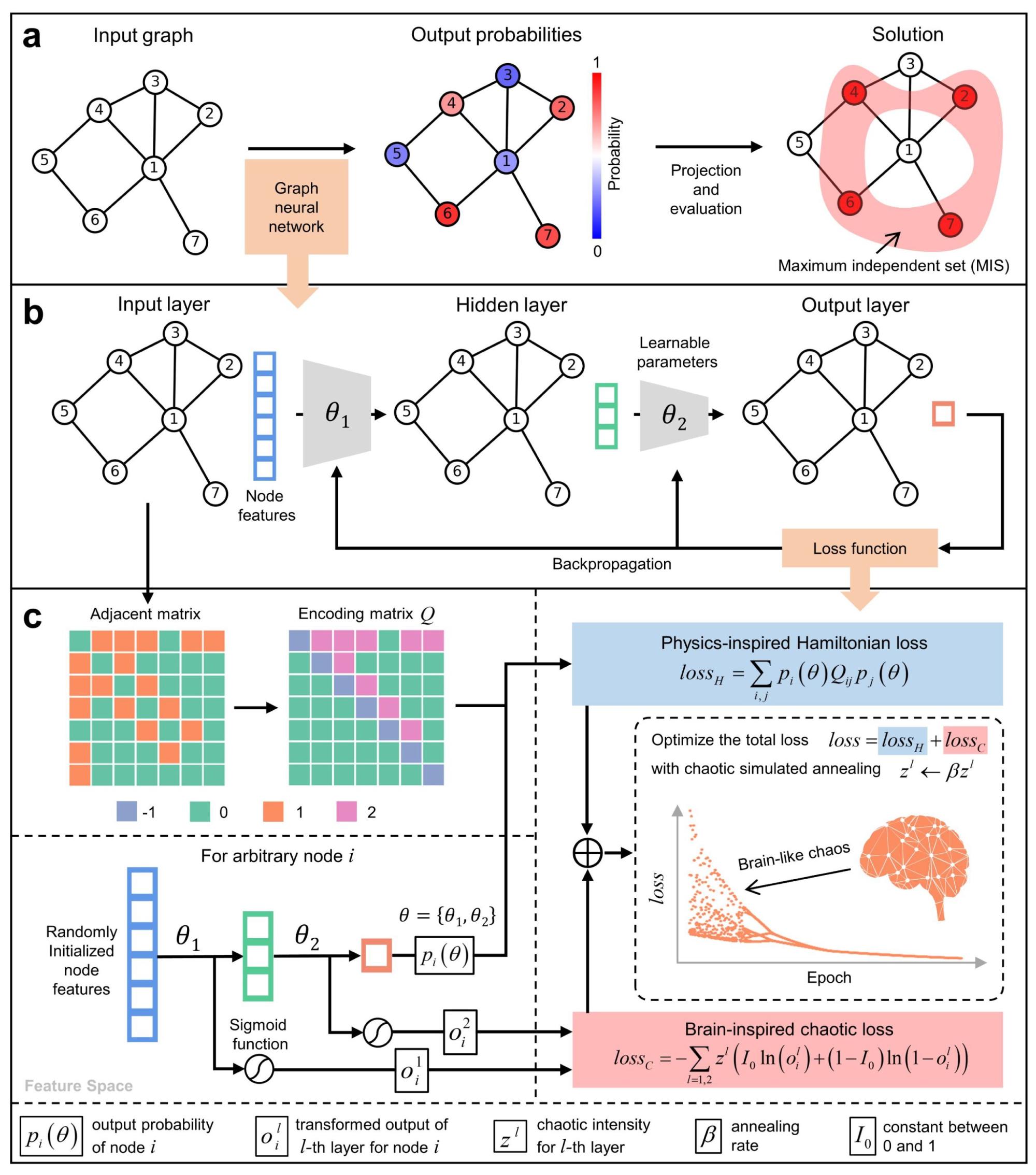 研究团队基于混沌动力学理论,创新性地将大脑的伪随机性和全局遍历性融入GNN训练过程。CGBP框架通过添加混沌损失项,使梯度更新过程呈现混沌动态,从而避免陷入局部最小值。该方法首次将组合优化问题转化为GNN的训练任务,利用延迟嵌入和混沌模拟退火策略,实现了高效的大规模问题求解。如图1所示,CGBP将问题映射到GNN训练中,通过概率输出投影得到最终解。