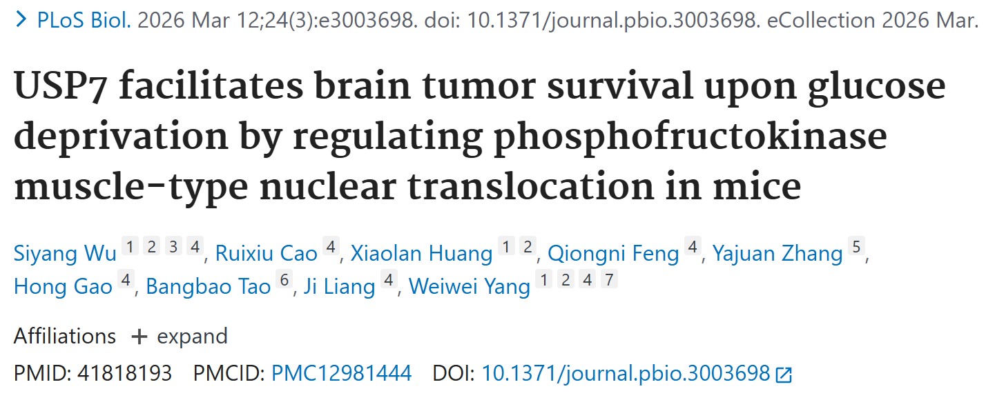 近日,国际知名学术期刊《PLOS Biology》正式在线发表了国科大杭州高等研究院杨巍维课题组的研究论文“USP7-mediated PFKM nuclear translocation sustains tumor cell survival upon glucose deficiency by activating fatty acid oxidation”。该研究首次揭示糖酵解限速酶PFKM在葡萄糖缺乏条件下经由USP7去泛素化修饰转位入核,通过激活脂肪酸氧化(FAO)通路促进胶质母细胞瘤(GBM)细胞存活的新机制,为靶向肿瘤代谢重编程的治疗策略提供了全新视角。