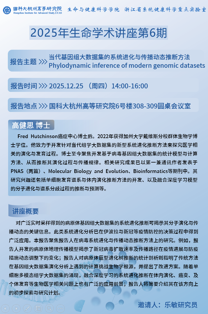 报告概要:对广泛实时采样得到的病原体基因组大数据集的系统进化推断可揭示其分子演化与传播动态的关键信息。此类系统进化分析已在伊波拉与新冠等疫情防控的决策过程中得到广泛应用。本报告聚焦报告人在病毒系统进化与传播动态推断方法上的研究。例如,报告人开发的病原体地理传播模型揭示了新冠病毒扩散速率及传播路径在疫情进展与防疫措施动态调整下的变化;报告人对病原体巨型进化树推断的统计剖析则指明了传统方法在基因组大数据集演化分析上遇到的计算挑战生物学根源,并提出了改进方案。随着单细胞多模态组学大数据集的涌现,融合深度学习的系统进化推断在体内演化、癌变、及个体发育等生物医学相关问题上也有广泛的应用前景;报告人将简要介绍其在该方向上的初步探索与研究计划。