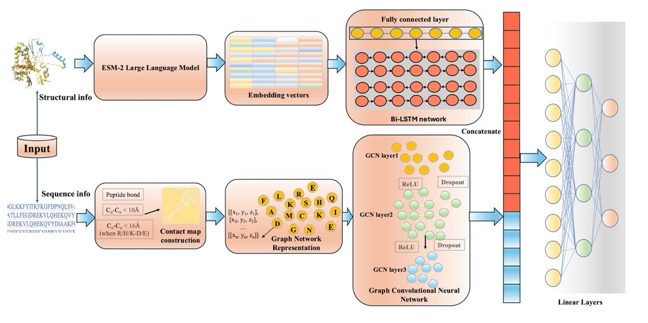 图1 预测模型概览 该模型主要由结构信息处理模块和序列信息处理模块构成。两个模块输出的特征向量经拼接后,通过全连接网络进行降维以生成最终预测结果。具体而言,结构信息处理模块基于氨基酸的原子级三维坐标构建接触图,并利用图神经网络进行处理;序列信息处理模块则通过大语言模型获取表征,再经由线性层和双向长短期记忆网络(Bi-LSTM)进行特征加工。