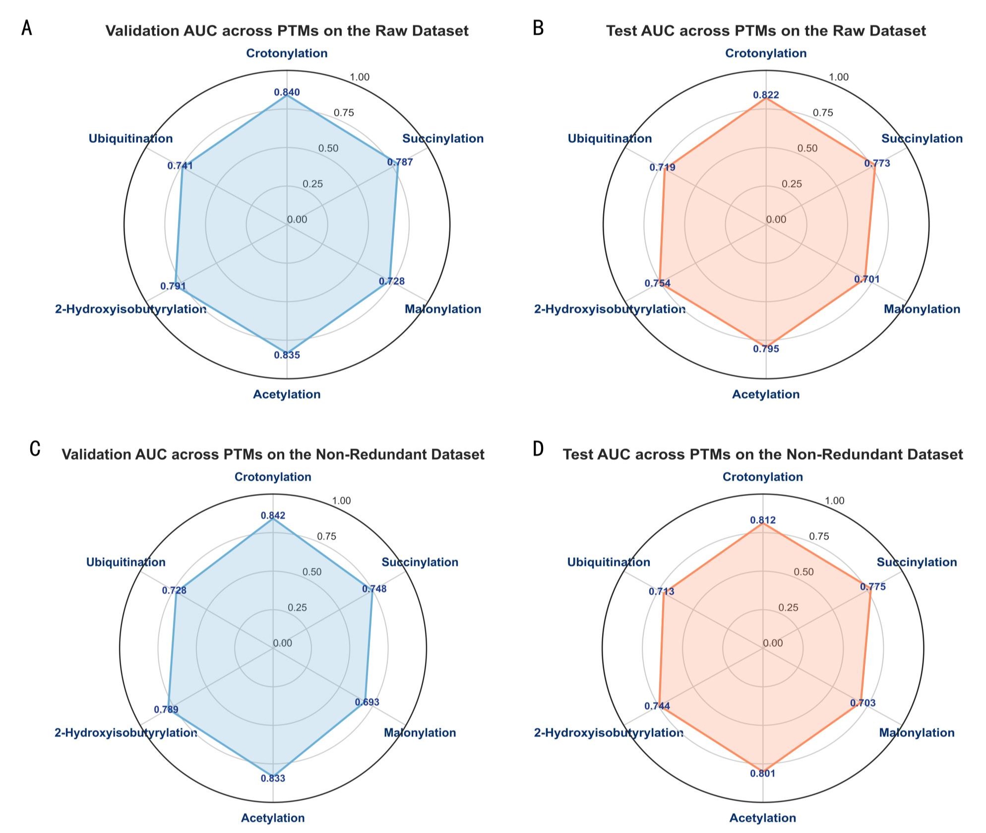 图2 不同数据模式下,模型在六种翻译后修饰类型中的AUC性能表现 A. 原始数据集上各修饰类型的验证集AUC B. 原始数据集上各修饰类型的测试集AUC C. 非冗余数据集上各修饰类型的验证集AUC D. 非冗余数据集上各修饰类型的测试集AUC。