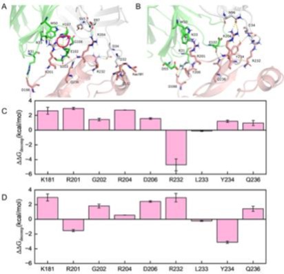 图3 hCLEC12A翻译后修饰对50C1抗体识别的影响。(A) 50C1与hCLEC12A的结合界面示意图:(A) K181乙酰化修饰与(B) K174巴豆酰化与K181乙酰化双修饰情况。黄色虚线、青色虚线与紫色虚线分别代表氢键、盐桥及π-π堆积相互作用。关键残基的单位点结合自由能分解变化:(C) K181乙酰化修饰及(D) K174巴豆酰化与K181乙酰化双修饰体系相较于未修饰纯体系的能量差异(∆∆Gdecomp=∆Gdecomp(修饰体系)-∆∆Gdecomp(纯体系))。数据以均值±标准误表示,数值越小表示该氨基酸对hCLEC12A与50C1结合的贡献越大。