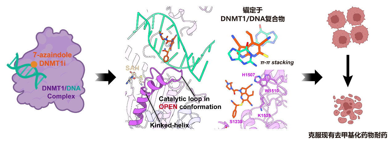 启动子区域DNA过度甲基化可导致关键抑癌基因表达沉默,从而驱动恶性肿瘤发生与进展。抑制DNA甲基转移酶DNMT1、逆转异常甲基化并恢复抑癌基因表达,已成为肿瘤治疗的重要策略。当前,核苷类去甲基化药物地西他滨和阿扎胞苷虽已获批用于AML等血液肿瘤一线治疗,但其作用依赖掺入DNA并诱导DNMT1形成高细胞毒性的DNA-蛋白交联物,进而引发显著DNA损伤与剂量限制性毒性。受此限制,现有去甲基化药物的临床响应率仅约为40%,且大多数初始有效患者在两年内出现获得性耐药,预后不佳。因此,开发毒性更低、能够克服核苷类去甲基化药物耐药的新型DNMT1抑制剂具有重要临床价值。